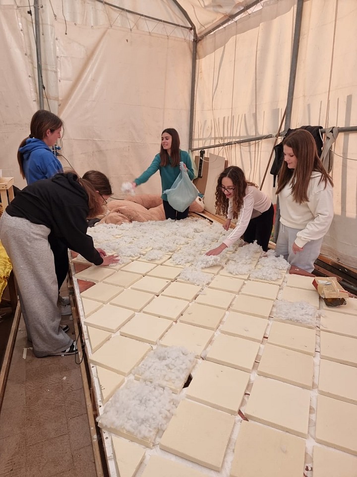 Breve descrizione della realizzazione (materiali, tecniche, particolarità...): Il pavimento delle basi è stato realizzato con polistirolo e lanetta, poi rivestiti in ciniglia a mo’ di trapunta. Gli elementi iconografici sono stati costruiti in legno e cartone, con rivestimento in juta, gomma eva, stoffa e corda.